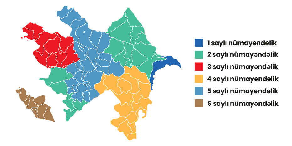 Nümayəndəliklər 1 saylı nümayəndəlik Binəqədi, Qaradağ, Xəzər, Səbail, Sabunçu, Suraxanı, Nərimanov, Nəsimi, Nizami, Pirallahı, Xətai, YasamalQalib Yadigarov: 055 544 06 45Rafael Məmmədov: 055 315 86 85 2 saylı nümayəndəlik Sumqayıt, Abşeron, Siyəzən, Xızı, Şabran, Xaçmaz, Quba, Qusar, Şamaxı, Qobustan, Ağsu, İsmayıllı, Zəngilan, Qubadlı, Cəbrayıl, Kəlbəcər, LaçınMais Məsimov: 050 356 54 37Aydın Süleymanov: 050 273 38 02 3 saylı nümayəndəlik Gəncə, Şəmkir, Qazax, Ağstafa, Tovuz, Goranboy, Göygöl, Samux, Gədəbəy, Daşkəsən, NaftalanMehman Allahverdiyev: 055 718 18 88Vüsal Qarayev: 055 833 04 04 4 saylı nümayəndəlik Lənkəran, Astara, Lerik, Yardımlı, Masallı, Biləsuvar, Cəlilabad, İmişli, Sabirabad, Şirvan, Hacıqabul, Salyan, Beyləqan, Neftçala, Saatlıİlham Məmmədov: 050 722 16 95Cəfər Teyfi-İbadzadə: 050 861 28 08 5 saylı nümayəndəlik Mingəçevir, Göyçay, Kürdəmir, Ucar, Zərdab, Ağdaş, Yevlax, Balakən, Zaqatala, Qax, Şəki, Bərdə, Ağdam, Tərtər, Qəbələ, Oğuz, Ağcabədi, Füzuli, Xocavənd, Xocalı, Xankəndi, ŞuşaNamət Şirinov: 050 668 48 54Niyazi Əhmədov: 051 513 13 12 6 saylı nümayəndəlik Naxçıvan, Şərur, Ordubad, Şahbuz, Culfa, Sədərək, Kəngərli, Babək.